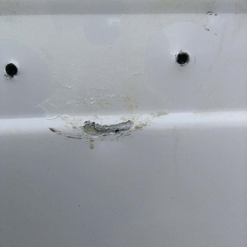 Now here comes the worms out of the can bit. While cleaning all the silicone off each of the mounting plates we noticed the one from the centre had white gunk which looked like corrosion. Inspecting the caravan wall we could see a small scratch and the bare aluminum exsposed had started to corrode. A bit of prodding with a screw driver a small hole developed allowing us to see the polystyene insulation sandwich between the inner and outer walls. This worried me a little as how long had the corrosion been there and had enough of the wall integrity collapsed allowing the water to seep into the frame.