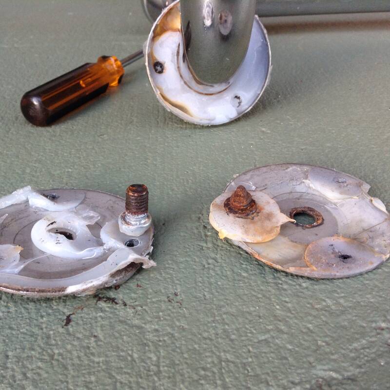 Fast forward a few months our long term stop in Walkamin seemed like a good opportunity to try to repair the post's mount. We had sent an email to Retreat as we had no idea how it was mounted initially we had assumed it was all siliconed on. Retreat sent back an e-mail with some description on how to remove it but to me it didn't make much sense (untill I read the email again after we removed the rail). Looking on the internet we found similar types of grab rails and from the technical spec we realised the chrome flange attached to the wall were actually concealment caps and the mounting plates attached to a wall by self tappers were under that. According to the diagram the flanges are twist caps but because they are so full of silicone the only way I could remove them was to pry them off with a screw driver.