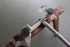 Since corrosion had occured with the old rail between the nickle plated mounting plate and the Aluminum cladding of the van to prevent it happenning again we bought some gasket material from an auto supplier to separate the two surfaces. Cutting it into round disks I gooped up with silicone filling all the cavity between the gasket and grab rail's mounting plate. After leaving it for a few days to dry we put it up against the back of the van. The bar length was slightly shorter (by a few milimetres) from the original so opted to redrill new holes instead of trying to line up the old ones.