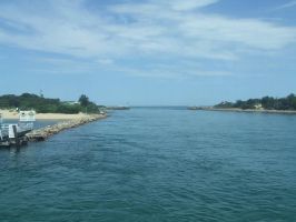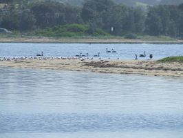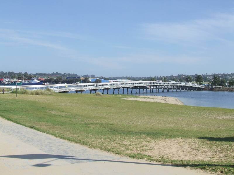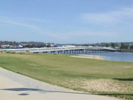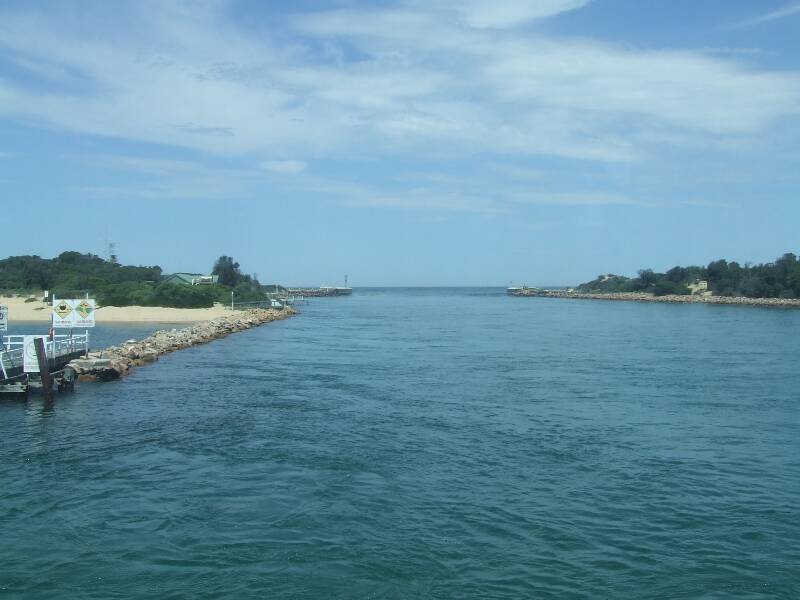 Lakes Entrance itself is a town of about 9,500 people and is well geared towards tourism with many types of accomodation available. The place is pretty much booked during the Christmas and January school holidays but has a mass exodus on the 26th of January when a lot of accomodation becomes available and the rates drop from a peak price to something approaching normal. For example the caravan park we are staying at during the peak season charge about $90.00 per night for a powered caravan site. Post holiday season we have been able to secure a site with discounts and specials for about $31.00 per night for the same piece of land. The park is quite nice and located within walking distance of the beach and town is about 1.5 Km away accessable by a walking path or road. Sea side of lakes Entrance is 90 Mile beach and is accessable via a walkway from the centre of town.