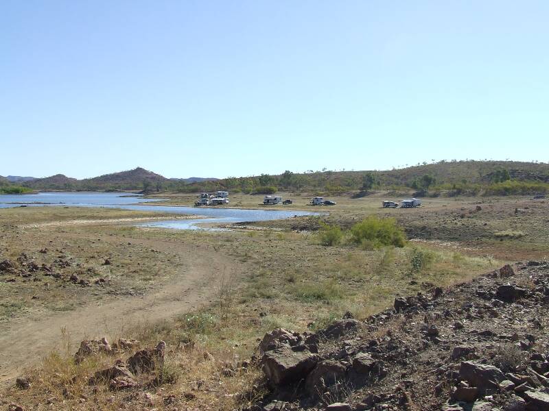 Anne had also noted from the camps book there was another area to camp about 12km up the road called Corella Dam. The access road in was much better and although not sealed was a reasonable gravel track not to corrigated and only about 2 km long. Coming over the hill we spied the dam with quite a number of vans parked next to it. Went around the left hand side and found a flat area which still had nice views of the water but a little more protected from the wind and a few less vans. We found a nice spot to park between a stand of trees and far enough away from other vans. The dam was a good spot to camp but there were no facilities so you needed to take everthing you need in and your waste back out again. We met another couple Leanne and Nev who came in after us they were from Mt Beauty in Victoria and were also tavelling around Australia.
