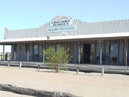 From Cloncurry we headed towards Winton. About 12 Kms east you turn right off the Barkley Hwy and head down the Landsborough Highway which is also known as the Matilda Way. If we had continued along the Barkley we would have ended up in Townsville. McKinlay is about a third of the way to Winton and is famous for being the place where the scenes in the Walkabout Creek Hotel bar for the Paul Hogan film Crocodile Dundee were filmed. We stopped for a photo and a drink at the bar. The outside is different but the inside still looks exactly as it was in the film. After a few kilometres further down the road we pulled over for the night at a rest area.