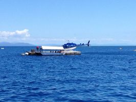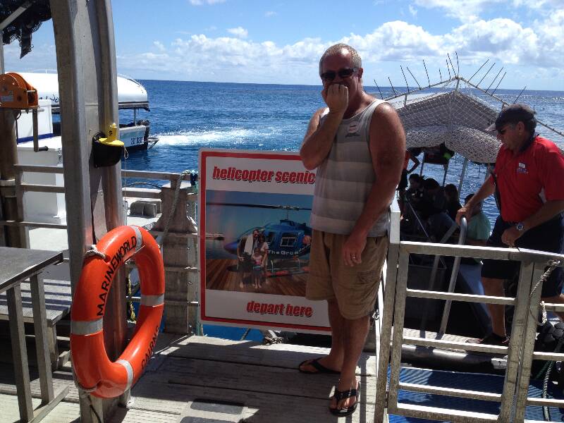 On the day we drove out to the Harbour checked in at terminal then boarded our boat after having the obligatory no obligation photo taken. The 90 minute trip out was reasonably smooth, a good sign the weather was going to be okay. On the way out the staff would try to sign you up for one of the paid activities on offer it was up to you if you wanted to do them or not. Graham wanted to do a Helichopter flight over the reef. Rhonda nor Anne wanted to go so I signed up as well. Our flight time would be given to us once we arrived at our destination.