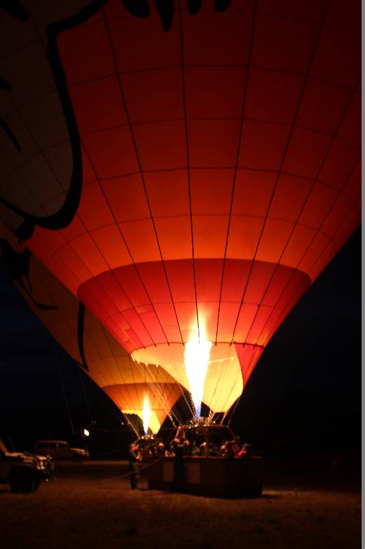 Arriving at the launch site is something to see. It is dark then suddenly lit up with the burner flames illuminating the inside of the balloon's and lighting up the surrounding area. These balloons are quite large as high as a mountain with little wicker baskets suspended underneath big enough to hold 24 paying passengers. The bus stopped and the driver called our names for us to get off where he then led us over to a balloon slightly smaller than the others with enough space for 2 passengers and the pilot. Now we understood what the bus driver was talking about we had received a free upgrade.