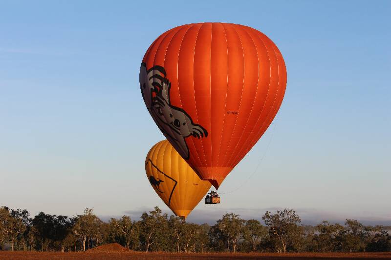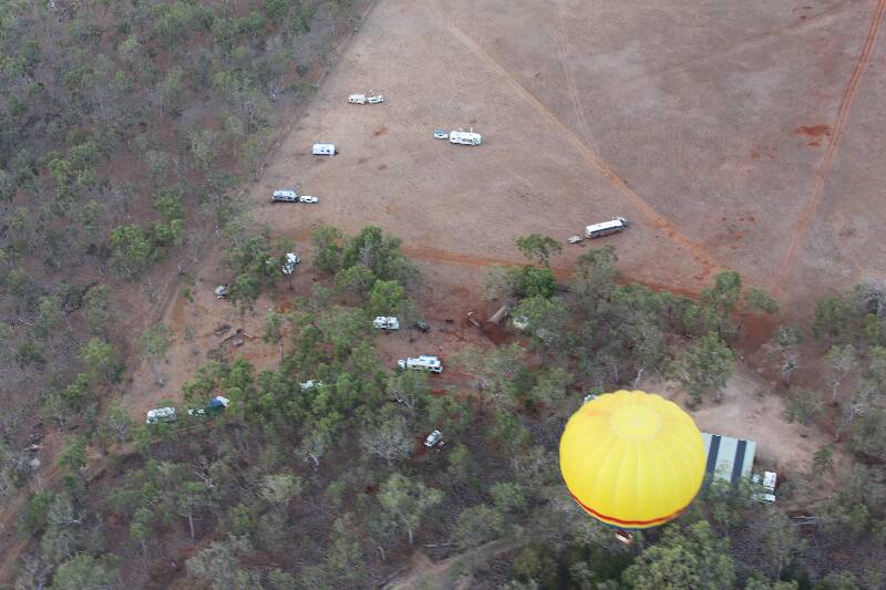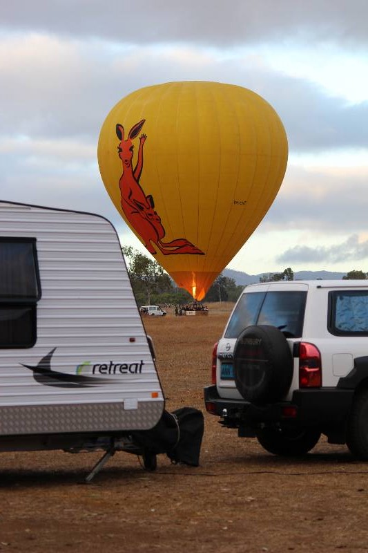 The cost was $10.00 per night without power and $15.00 per night with power. The camp area has a large central fire where each evening everyone sits giving you the chance to meet new people and listen to their stories of travel around Australia and the world. Dave the owner who would have to be the most bushy bloke you could meet would join in and relate his tales from many a year ago. It was up to you to work out if they were true or not. The main reason we chose here is we heard if you stay at Ringers Rest you could ring up the balloon flight company, called "Hot Air" after 7pm and if there are any spare spaces you can get a 30 minute flight for a standby rate of $90.00 ea instead of the usual $225.00 ea. I had always wanted to do a balloon flight but up till now the places we had been that offered a flight was expensive for us. I was pretty keen to go but Anne wasn't to sure and felt a bit reserved wanting to see one land before making a decision as we were told they often touchdown in the same paddock we had parked the van in.