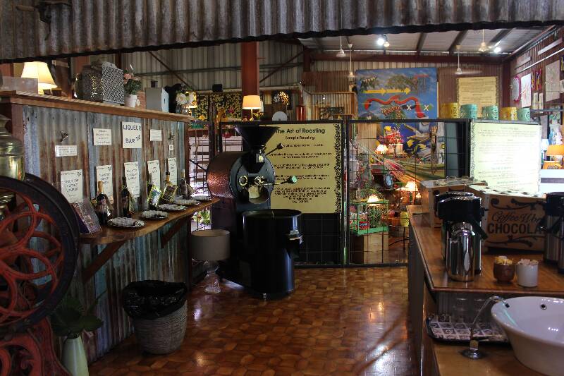 In Mareeba we visited Coffeeworld which is part of the Coffeeworks company. We payed $14.00 ea as an entry fee then were able to sample as much coffee, Chocolate and Coffee Liqueurs as we could handle. This occured to me a backpackers paradise especially you liked Coffee and Chocolate. Between bouts of tastings there is a Museum dedicated to all things coffee which has the largest collection of coffee pots, perculators, expresso machines, coffee bean roasters, etc...etc... I had ever seen. We didn't realise there were so many and indead how long the human race has been roasting, expressing and perculating coffee for.