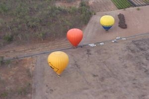 We drifted over farms and rivers waching the light grow all around as the sun rose above the mountain range to the east. We travelled in a westerly direction which took us almost directly over Ringers Rest where we could see our caravan in amongst all the others. We could also our fellow travellers out looking up and taking photos as we drifted over. Ahead we could see our landing site where all the Balloons signaled it by lining up in front of us. Our trip was coming to an end so quickly and with sadness we touched down next to all the others watching as they were changing over with a fresh lot of tourists. This was when we got our second surprise the pilot told us we were staying on board and get to travel the second half hour wow all this for a standby rate how lucky were we.