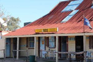 The pub is pretty much as it was back in the 1900 including old hitching rails still out the front and the inside walls lined with hessian. There has been some modernisation like electric light and refrigeration. John Murray who depicts outback australia has adorned some of the doors and shutters with his art.
