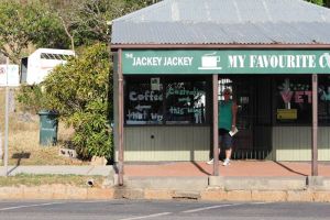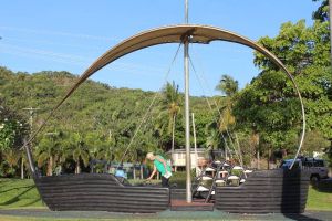 From there we walked along the riverside waterfront where a number of statues and cairns signified important events that occured on that spot. There is a statue of Cook himself as well as a cairn which identifies the location the Endevour was beached. Also on the waterfront was this large model of a sailing ships where musical instruments made from plastic pipes and wood had been built into it. This was a great place for kids young and old to discover their musical talents or lack off. Further up the main road was an interesting shop called The Jackey Jackey shop which had once been a Cafe but was now a vet surgery. There is an interesting sign painted on the windows pointing coffee in one direction and castration in the other.
