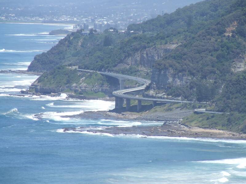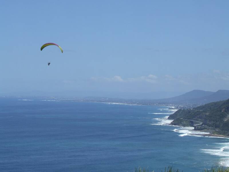 Next day we followed part of the Grand Pacific Drive which its full length stretches from Nowra to Sydney from Kiama to Stanwell Tops. The drive took us through Wollongong where we stopped at the tourist bureau to get more information on what to look at further on. Leaving Wollongong the road winds it way through costal suburbia until Bulli then heads on through the costal villages of Wombarra, Scarborough, Clifton, Coalcliff and Stanwell. Between Clifton and Coalcliff is the Sea Cliff Bridge which runs for 3 km around the coast over the water. The bridge replaces the old cliff road which was closed due to parts of the cliff face continuiously falling onto the road. The road was going to remain closed but the residents of Coalcliff and Clifton lobbied to have it reopened to relink the villages again. We stopped at Stanwell for a picnic lunch and watched the hanggliders that launch from Bald Hill come in for a landing. After lunch we headed up to Bald hill for a panoramic view all the way back towards Wollongong. We watch as Gliders launched themselves from the cliff edge some carrying passengers for a ride. |