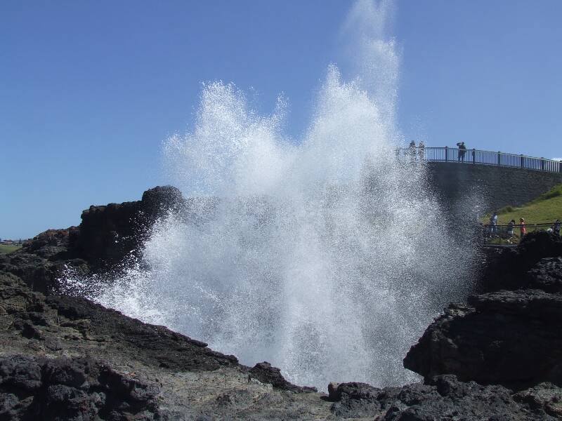 Touring around the township of Kiama we visited the Big Blow Hole just below the lighthouse. There are boardwalks built around the blowhole so you can view it from a number of angles as well as giving you a 180 degree vista out to sea. From the blowhole you can walk down to the sea water swimming pool which is carved into the basalt rock right next to the ocean and provides safe swimming for people of all ages. From the pool is a short walk to the harbour where you can buy freshly caugh fish where we purchased some fresh prawns for dinner.