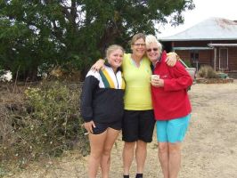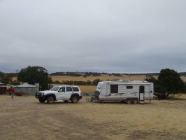 We left Cowarumup around 9am. The plan was to head to Bunbury, finish off any packing we hadn't completed, fuel up and grab some groceries. we were also going to catch up with the Browns as we hadn't seen them the day we had left. We also toyed with the idea of staying the night there and heading for Wave rock the next day but Anne hit on the idea she would like to catch up with Carla. Arriving in Bunbury we un-hitched the caravan in front of Mic and Carley's place we then went off shopping for groceries and fuel, returning within about an hour. We managed to catch up with Mr Brown but Mrs Brown was not at home. Saying goodby to Carley again we headed for Collie then onto Williams wher we turned right at Dyrandra then headed for Carla's place. After taking a number of wrong turns we foud the correct street. You will all be pleased to know the caravan is no longer a gravel road virgin as we had 14 kms of gravel to drive down. Fortunately the dust stayed on the outside with only a little bit getting inside near the door. Carla her partner John and Daughter Brittany live on a farm with a panoramic view over rolling hills. After we arrived, our next challange was to find a level piece of ground which was no mean feat since the house is built on top of a hill. Once we had found a spot and leveled the caravan, Anne and Carla spent the evening catching up over dinner. Leaving the house to retire for the night Carla said watch out for the snakes which promped Anne to leap on my sholders as we headed for the van. |