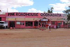 From here the road was a bit rougher all the way into Oodnadatta which took its toll on our bus breaking a fuel line. The driver had to make repairs while we had lunch at the pink roadhouse. We ordered an Oodnabuger with the lot which we only just managed to finish. Oodnadatta is a small town now