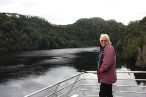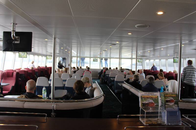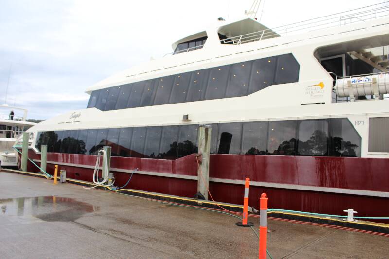 Getting back onto the train we setoff to our next stop Dubbil Barril crossing over a number of historic bridges long the way. Again we arrived were able to get off and look at or the historic information displays along the platform. As this was as far as we were going we watched how they disconnected the engine from the carriages then drove the engine onto a turntable to turn it around and re-attach it to the other end of the line of carriages for the journey back to Strahan. Dubbil Barril is also the start of the Rack and Pinion line which gives the train the unique ability to ascend and decend steep grades of up to 20:1. On the return journey we all swapped seats with the people on the opposite side of the carriage so we could look out the other window for a change of scenery. Day 2 we had booked in for the World Heritage Cruise which takes a run around Macquarie Harbour out through Hells Gate then up and back the Franklin River. There were still showers so we decided to drive to where the boat leaves from if it was fine we would have walk the 1.5 Km distance. Boarding the boat we were shown to our dedicated seat. There are 3 Classes of seating, standard which is along the centre of the main deck there are rows of seats going across the boat facing each other with a table in between. Next is Gold class which is a window seat on the main deck or a centre seat on the upper deck with finally a Premium class for window seats on the upper deck. Gold and Premium all have foward facing seats with a table that folds down from the seat in front like in an airplane. We hoped for and were lucky to get a gold class seat on the main deck which meant we had a window seat. Lunch is provided in the form of a smorgasboard and is the same food served for all seating classes.