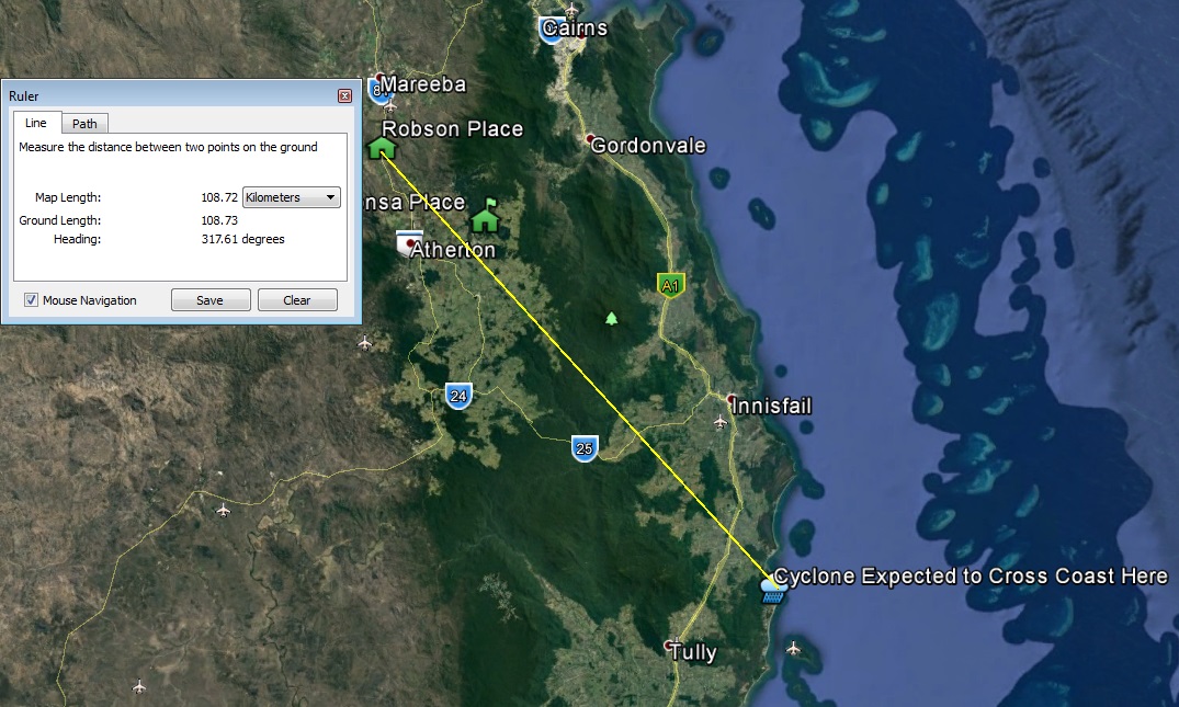 This afternoon a tropical cyclone advice was issued with the forecast track map showing that it could reach a category 3. Cyclones are very unpredictable and could move in any direction, forward, left or right or even do a U turn and head back out to sea. It is expected cross the coast about 100 odd kilometres south of us, near Mission Beach but this can easly change. We are not expecting the full cyclone force winds but there will be plenty of rain, which is badly needed up here. There is not much for us to cleanup around the house, we were preparing to leave anyway, with all loose items already stored away.