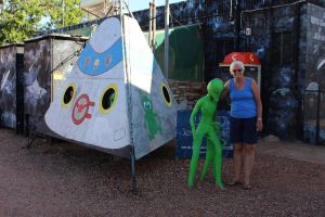 Between Alice Springs we had a couple of spots we wanted to see the first being the Devils Marbles about 100 Km south of Tennant Creek. There is a campground there which we heard makes a good overnight stop. The cost of $3.30 per person per night makes it a cheap place to stay. On the way we called into Wycliffe Well which is suppose to be the UFO capital of Australia has the greatest number of UFO's sightings in Australia. There is only a roadhouse and tourist park there but it has all been painted with figures of aliens and alien spacecraft on the walls as well as a number of lifesize models spread around the place.