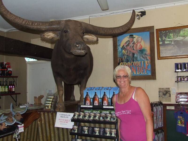 Next day leaving Hayes Creek we headed north for Berry Spring's Tumbling Waters Caravan Park. travelling through we stopped at Pine Creek and went into the Inn. We had camped at Pine Creek in 2008 and visited all the sights but had missed Charlie the water buffalo mounted on top of the bar at Pine Creek Inn. Charlie starred in Paul Hogans Crocodile Dundee 1 and 2 and lived at Pine Creek in a padock opposite the Inn and was a celebrity with many visitors. When he died they were unsure what to do with him and decided to have him stuffed and mounted on the bar as a tourist attraction.