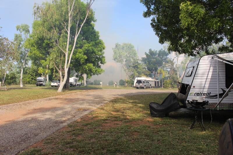 It can only happen in the Northern Territory. We decided to wash the car and caravan in Katherine as there is no water restrictions on use but the moment we put the water on the car the fire authority decided it would be a good idea to burn off the grass / bush right next door to the caravan park. Here we are washing the car with lots of black ash falling from the sky much to the amusment of the ground staff.